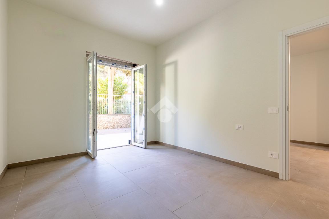Soggiorno con cucina a vista, Camera matrimoniale, Camera singola, Bagno finestrato, Giardino pavimentato.